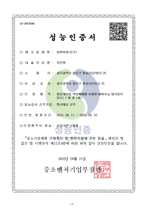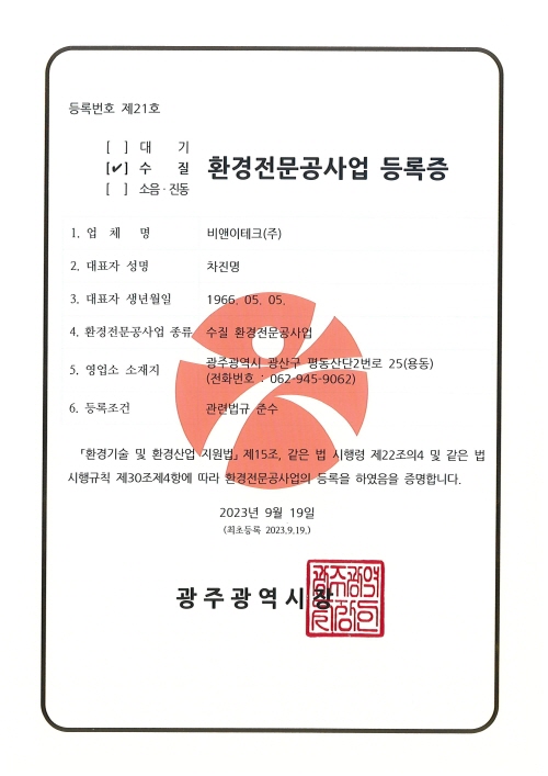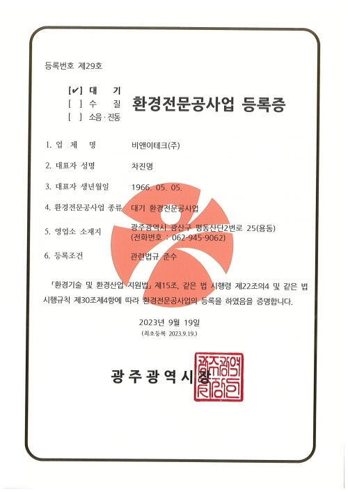 회사명 : 비앤이테크㈜ | 대표자명 : 차진명 | 전화번호 : 062-945-9062~4 | 팩스 : 062-945-9065