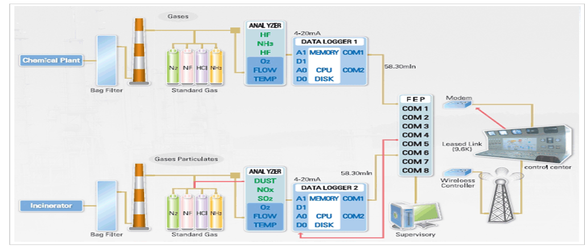 - A system that links air pollutant-emitting facilities and the control center online, enabling remote, automatic monitoring of the amount of pollutants emitted from stacks and of operating conditions.