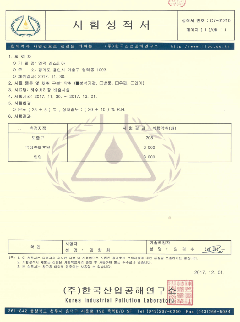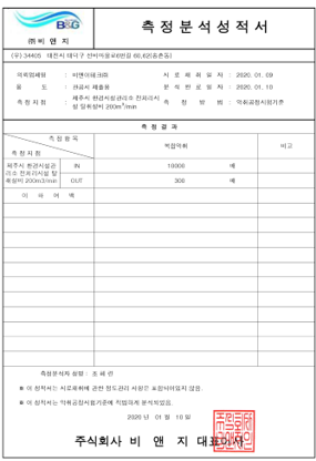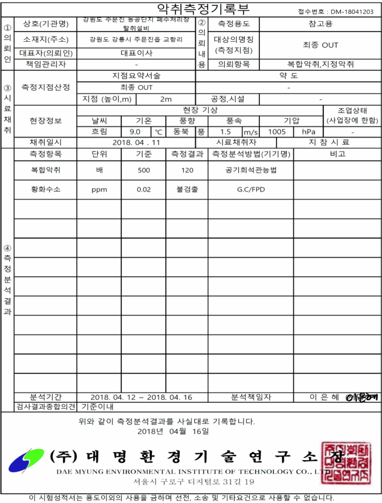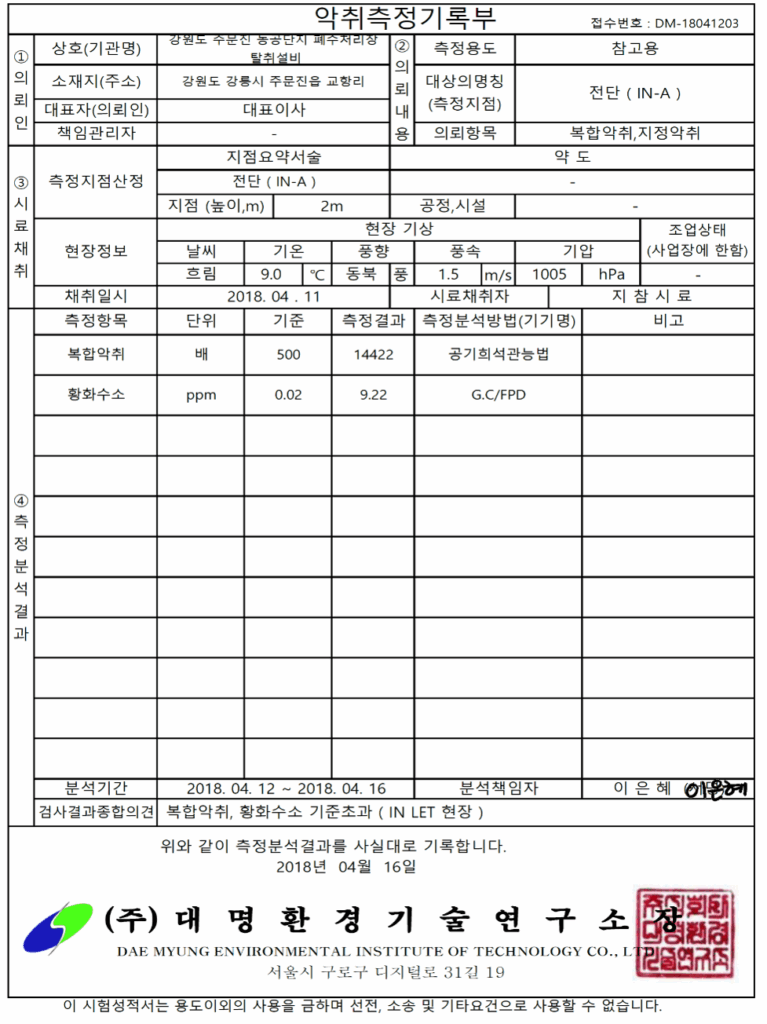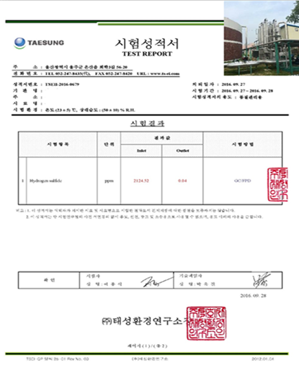 기존 가성소다 및 차아염소산나트륨 약액공법으로 고농도 악취물질을 처리하지 못하고 성능 기준을 초과하였으나 당사 공법 적용 후 성능 기준 만족
