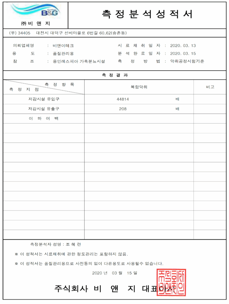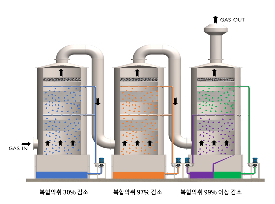 • 복합악취를 총 3단 3stage 제거과정을 통해 악취를 기준치 이하로 제거.