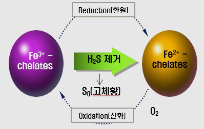 • 황화수소의 용해성과 촉매의 산화환원반응으로 고농도의 황화수소를 제거.